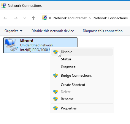 • Should re-enabling the network adapter have failed to resolve the issue, I would have considered resetting the TCP/IP stack with netsh int ip reset and netsh winsock reset and rebooting the computer.